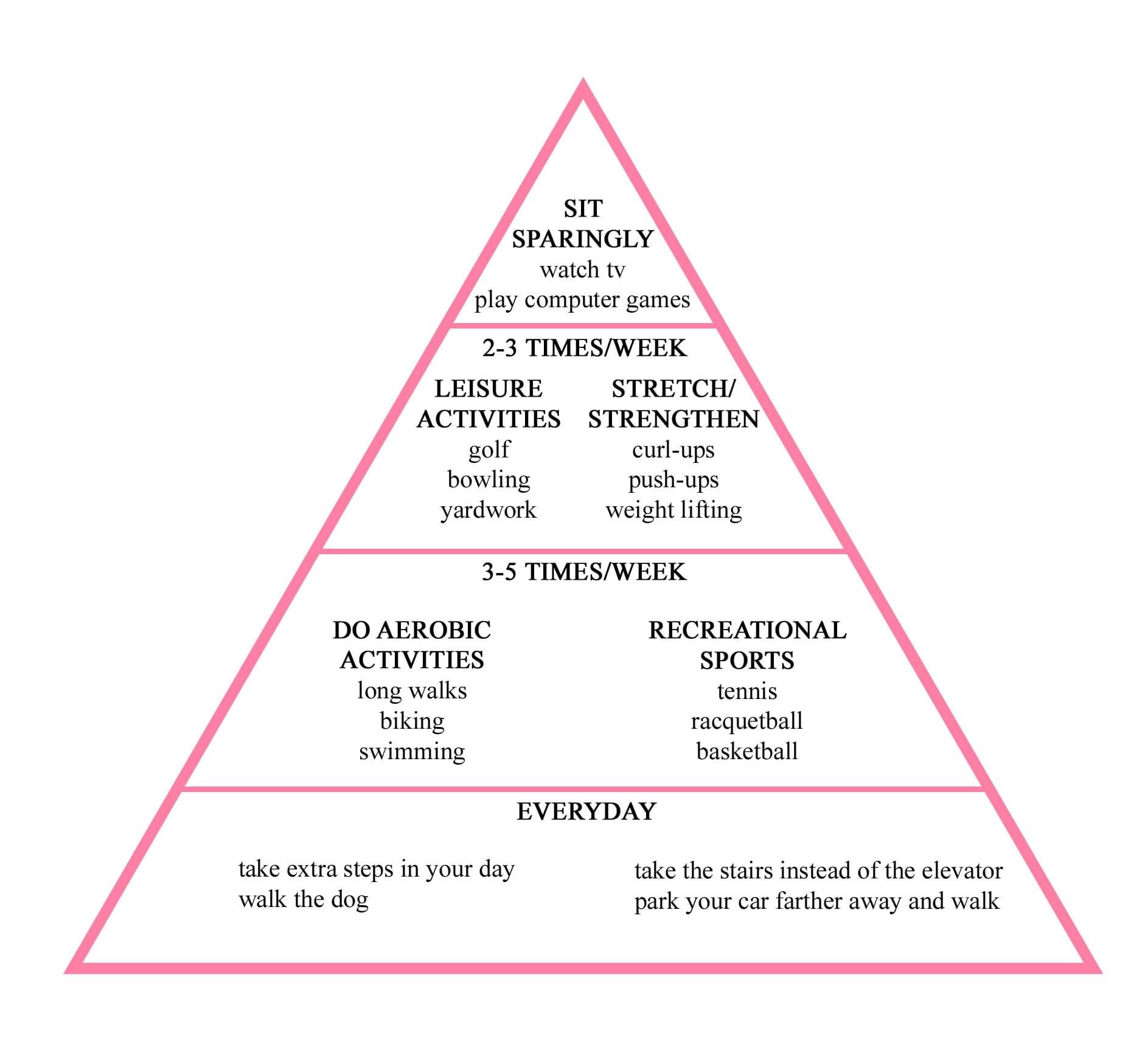 Start your weekly activity plan with the daily activities at the base of the pyramid. Enhance your fitness by choosing other activities on the pyramid. Move more, sit less.
